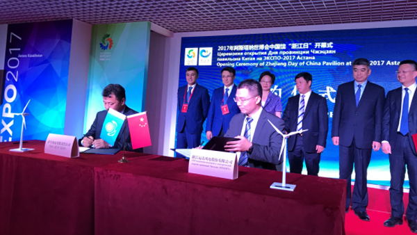 開幕式上,威尼斯9499登錄入口風(fēng)電與哈薩克斯坦薩爾風(fēng)電公司在阿斯塔納世博會(huì)浙江日舉行戰(zhàn)略合作協(xié)議簽約儀式,哈薩克斯坦Shar wind turbines LLP項(xiàng)目公司總經(jīng)理庫那分?托卡塔博拉特及威尼斯9499登錄入口風(fēng)電副總經(jīng)理斯建龍出席,哈方能源部部長馬克沃夫·馬拉杜勒與浙江省副省長梁黎明、中國駐哈薩克斯坦大使張漢暉見證了雙方合作的簽訂。